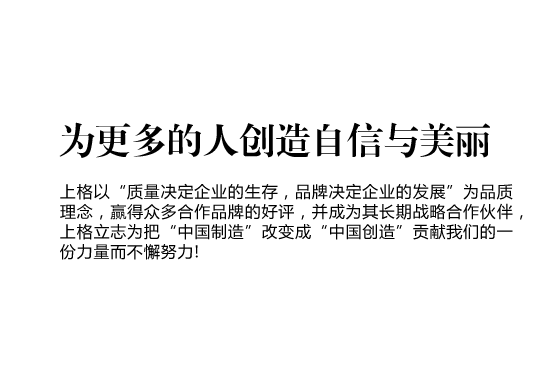• 上格一路走來,以“締造時尚集團,使公司受人尊敬,令人向往;為客戶提升價值,創(chuàng)造成功;讓員工提高生活品質(zhì),實現(xiàn)自我價值”作為我們的目標,“為更多的創(chuàng)造自信與美麗” 作為我們的使命,立志為把“中國制造” 改變成“中國創(chuàng)造”貢獻我們的一份力量而不懈努力!